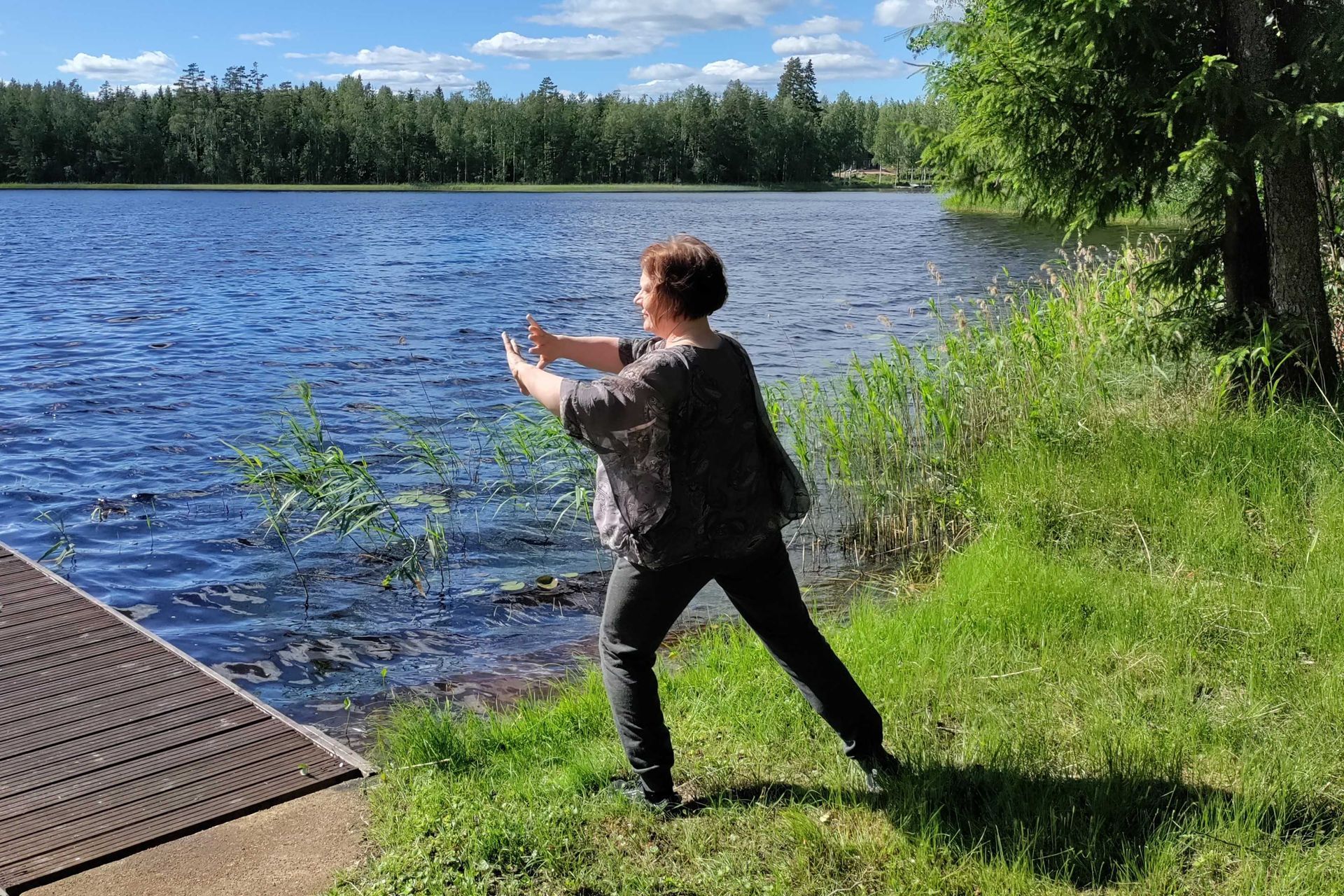 Ritvalla on ollut omassa taustassaan isojakin terveyshaasteita, joiden johdosta keho kaipaa säännöllistä kuntoutusta ja huoltoa. Ensikohtaamiset asahin kanssa eivät vielä innostaneet lajin pariin eikä vaikutuksiakaan päässyt lyhyissä n. vartin harjoituksissa vielä kunnolla huomaamaan, Ritva toteaa. Reilu kymmenen vuotta sitten sai Tuusulanjärven Reuma ry:n asahi-ohjaaja kuitenkin houkuteltua Ritvan mukaan kokonaiselle ohjatulle tunnille. Ja jo heti ensimmäisestä varsinaisesta asahi-tunnista lähtien Ritva jäi koukkuun lempeään ja kehoa huoltavaan lajiin.